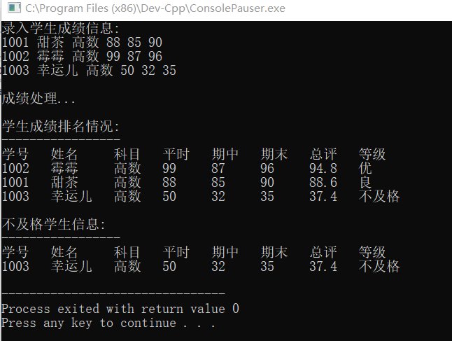 #include <stdio.h> #include <string.h> #define N 3 // 运行程序输入测试时,可以把这个数组改小一些输入测试 typedef struct student { int id; // 学号 char name[20]; // 姓名 char subject[20]; // 考试科目 double perf; // 平时成绩 double mid; // 期中成绩 double final; // 期末成绩 double total; // 总评成绩 char level[10]; // 成绩等级 } STU; void input(STU [], int); // 录入学生信息 void output(STU [], int); // 输出学生信息 void calc(STU [], int); // 计算总评和等级 int fail(STU [], STU [], int); // 统计不及格学生信息 void sort(STU [], int); // 排序 int main() { STU st[N], fst[N]; // 数组st记录学生信息,fst记录不及格学生信息 int k; // 用于记录不及格学生个数 printf("录入学生成绩信息:\n"); input(st, N); printf("\n成绩处理...\n"); calc(st, N); k = fail(st, fst, N); sort(st, N); printf("\n学生成绩排名情况:\n"); output(st, N); printf("\n不及格学生信息:\n"); output(fst, k); return 0; } void input(STU s[], int n) { int i; for(i = 0; i < n; i++) scanf("%d %s %s %lf %lf %lf", &s[i].id, s[i].name, s[i].subject, &s[i].perf, &s[i].mid, &s[i].final); } void output(STU s[], int n) { int i; printf("-----------------\n"); printf("学号 姓名 科目 平时 期中 期末 总评 等级\n"); for(i = 0; i<n; i++) printf("%d %-6s %-4s %-4.0f %-4.0f %-4.0f %-4.1f %s\n",s[i].id,s[i].name,s[i].subject,s[i].perf,s[i].mid,s[i].final,s[i].total,s[i].level); } void calc(STU s[],int n) { int i; for(i = 0; i < n; i++) { s[i].total = s[i].perf * 0.2 + s[i].mid * 0.2 + s[i].final * 0.6; if(s[i].total >= 90) strcpy(s[i].level, "优"); else if(s[i].total >= 80 && s[i].total < 90) strcpy(s[i].level, "良"); else if(s[i].total >= 70 && s[i].total < 80) strcpy(s[i].level, "中"); else if(s[i].total >= 60 && s[i].total < 70) strcpy(s[i].level, "及格"); else strcpy(s[i].level, "不及格"); } } int fail(STU s[], STU t[], int n) { int i, k = 0; for(i = 0; i < n; i++) if(s[i].total < 60) t[k++] = s[i]; return k; } void sort(STU s[], int n) { int i, j; STU t; for(i = 0; i < n-1; i++) for(j = 0; j < n-1-i; j++) if(s[j].total < s[j+1].total) { t = s[j]; s[j] = s[j+1]; s[j+1] = t; } }