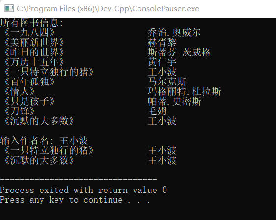#include <stdio.h> #include <string.h> #define N 10 #define M 80 typedef struct { char name[M]; char author[M]; } Book; int main() { Book x[N] = { {"《一九八四》", "乔治.奥威尔"}, {"《美丽新世界》", "赫胥黎"}, {"《昨日的世界》", "斯蒂芬.茨威格"}, {"《万历十五年》", "黄仁宇"}, {"《一只特立独行的猪》", "王小波"}, {"《百年孤独》", "马尔克斯"}, {"《情人》", "玛格丽特.杜拉斯"}, {"《只是孩子》", "帕蒂.史密斯"}, {"《刀锋》", "毛姆"}, {"《沉默的大多数》", "王小波"} }; Book *ptr; int i; char author[M]; printf("所有图书信息: \n"); for(ptr = x; ptr < x + N; ++ptr) printf("%-30s%-30s\n", ptr->name, ptr->author); printf("\n输入作者名: "); gets(author); for(ptr = x; ptr < x + N; ++ptr) if(strcmp(ptr->author, author) == 0) { printf("%-30s%-30s\n", ptr->name, ptr->author); } return 0; }