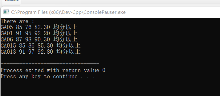 #include <stdio.h> #include<string.h> #define N 100 typedef struct { char num[10]; // 学号 int s1; // 期末成绩 int s2; // 平时成绩 double sum; // 总评 char level[10]; // 等级 } STU; int fun(STU a[], int n, STU h[]); // 函数声明 int main() { STU s[N]={ {"GA05", 85, 76}, {"GA03", 76, 90}, {"GA02", 69, 90}, {"GA04", 85, 56}, {"GA01", 91, 95}, {"GA07", 72, 80}, {"GA08", 64, 45}, {"GA06", 87, 98}, {"GA015", 85, 86}, {"GA013", 91, 97} }; // 原始学生成绩记录 STU h[N]; // 保存均分以上学生记录 int i, k, n = 10; // 调用fun对学生成绩记录进行处理 k = fun(s, n, h); // 输出均分以上学生记录 printf("There are :\n"); for(i = 0; i < k; i++) printf("%s %d %d %.2f %s\n", h[i].num, h[i].s1, h[i].s2, h[i].sum, h[i].level); return 0; } // 函数定义 // 功能:对包含n条学生成绩记录的数组a进行处理: // 计算总评成绩,统计等级为"均分以上"的学生记录保存到数组h中,并返回其人数 int fun (STU a[], int n, STU h[]) { int i,j=0; double s=0.0,ave; for(i=0;i<n;i++) a[i].sum=0.3*a[i].s2+0.7*a[i].s1; for(i=0;i<n;i++) s=s+a[i].sum; ave=s/n; for(i=0;i<n;i++) { if(a[i].sum>ave) { strcpy(a[i].level,"均分以上"); h[j++]=a[i]; } } return j; }