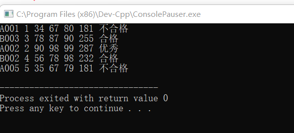 #include <stdio.h> #include <string.h> #define N 5 typedef struct student { char name[10]; int num; int maths; int computer; int english; int sum; char level[10]; } STU; void fun(STU a[], int n); // 函数声明 int main() { STU s[6*N]={ {"A001", 1, 34, 67, 80}, {"B003", 3, 78, 87, 90}, {"A002", 2, 90, 98, 99}, {"B002", 4, 56, 78, 98}, {"A005", 5, 35, 67, 79} }; int i; fun(s, N); for(i = 0; i < N; i++) printf("%s %d %d %d %d %d %s\n", s[i].name, s[i].num, s[i].maths, s[i].computer, s[i].english, s[i].sum, s[i].level); return 0; } // 函数定义 // 功能:对包含n条学生成绩记录的数组a进行处理: // 计算三门课程总分、总分最大值、总分最小值,并设置等级: // 总分与总分最大值相等的同学的等级设置为优秀 // 总分与总分最小值相等的同学的等级设置为不及格 // 其余同学的等级设置为合格 void fun(STU a[], int n) { int i,max=a[0].sum,j; for(i=0;i<n;i++) a[i].sum=a[i].maths+a[i].computer+a[i].english; for(i=0;i<n;i++) { if(a[i].sum>max) max=a[i].sum; j=i; } int min=a[j].sum; for(i=0;i<n;i++) { if(a[i].sum<min) min=a[i].sum; } for(i=0;i<n;i++) { if(a[i].sum==max) strcpy(a[i].level,"优秀"); else if(a[i].sum==min) strcpy(a[i].level,"不合格"); else strcpy(a[i].level,"合格"); } }