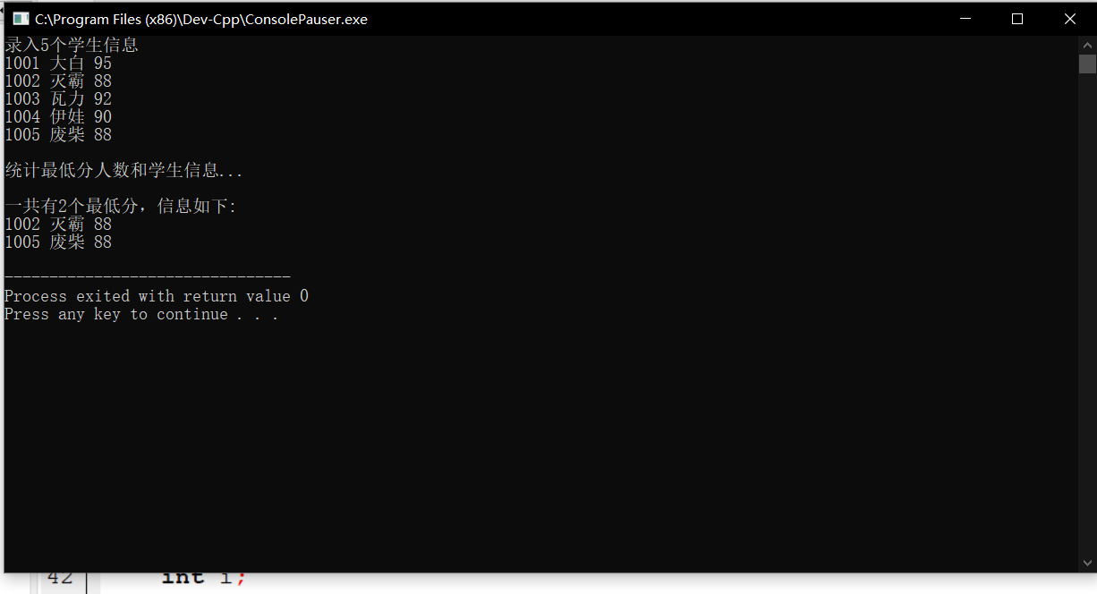 #include <stdio.h> #define N 5 // 定义结构体类型struct student, 并定义STU为其别名 typedef struct student { long no; char name[20]; int score; } STU; // 函数声明 void input(STU s[], int n); int find_min_list(STU s[], STU t[], int n); void output(STU s[], int n); int main() { STU stu[N], min_list[N]; int count; printf("录入%d个学生信息\n", N); input(stu, N); printf("\n统计最低分人数和学生信息...\n"); count = find_min_list(stu, min_list, N); printf("\n一共有%d个最低分,信息如下:\n", count); output(min_list, count); return 0; } // 输入n个学生信息,存放在结构体数组s中 void input(STU s[], int n) { int i; for(i=0;i<n;i++) scanf("%d%s%d\n",&s[i].no,s[i].name,&s[i].score); } void output(STU s[], int n) { int i; for(i=0;i<n;i++) printf("%d %s %d\n",s[i].no,s[i].name,s[i].score); } // 在结构体数组s中,查找最低分学生的记录,将其存入结构体数组t中 // 形参n是结构体数组s中元素个数 // 函数返回最低分的学生人数 int find_min_list(STU s[], STU t[], int n) { int i,min=100,j=0; for(i=0;i<n;i++) { if(s[i].score<min) min=s[i].score; } for(i=0;i<n;i++) { if(s[i].score==min) t[j++]=s[i]; } return j; }