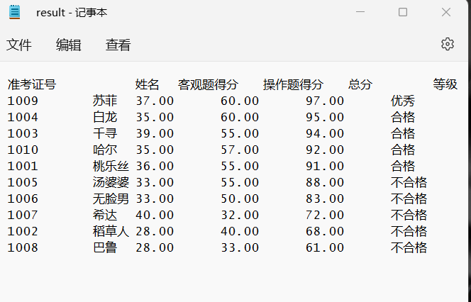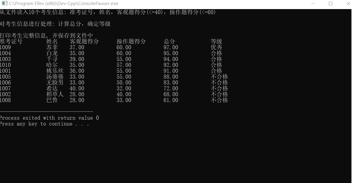 int i,j; STU t; for(i=0;i<n;i++) s[i].sum=s[i].objective+s[i].subjective; for(j=0;j<n;j++) for(i=0;i<n-j-1;i++) { if(s[i].sum<s[i+1].sum) { t=s[i+1]; s[i+1]=s[i]; s[i]=t; } } for(i=0;i<n;i++) { if(i<0.1*(n-1)) strcpy(s[i].level,"优秀"); if(i>=0.1*(n-1)&&i<0.5*(n-1)) strcpy(s[i].level,"合格"); if(i>=0.5*(n-1)) strcpy(s[i].level,"不合格"); }