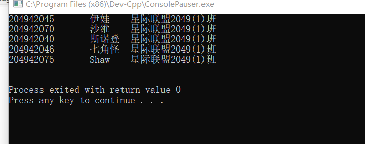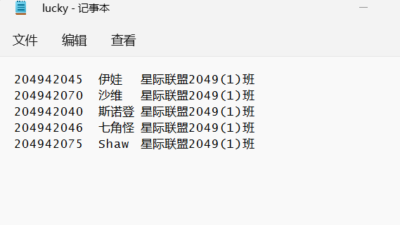 //task 6#define _CRT_SECURE_NO_WARNINGS #include <stdio.h> #include <stdlib.h> #include <time.h> #include <string.h> typedef struct { long int no; char name[20]; char clas[100]; } STU; int main() { int i,j; STU x[80]; STU lucky[5]; FILE *fp; fp = fopen("D://list.txt", "r"); if(fp == NULL) { printf("fail to open file\n"); return 1; } while(!feof(fp)) { for (i = 0; i < 80; i++) fscanf(fp, "%ld%s%s", &x[i].no,x[i].name, x[i].clas); } fclose(fp); FILE *fp2; fp2 = fopen("D://lucky.txt", "w"); if(fp2 == NULL) { printf("fail to open file\n"); return 1; } srand ( time ( NULL ) ) ; for(i=0;i<5;i++) lucky[i].no=204942000+rand()%80+1; for (i = 0; i < 5; i++) { for (j = 0; j < 80; j++) { if (lucky[i].no == x[j].no) lucky[i] = x[j]; } } for(i = 0; i < 5; ++i) { fprintf(fp2,"%ld\t%s\t%s\n", lucky[i].no, lucky[i].name,lucky[i].clas); printf("%ld\t%s\t%s\n", lucky[i].no, lucky[i].name,lucky[i].clas); } fclose(fp2); return 0; }