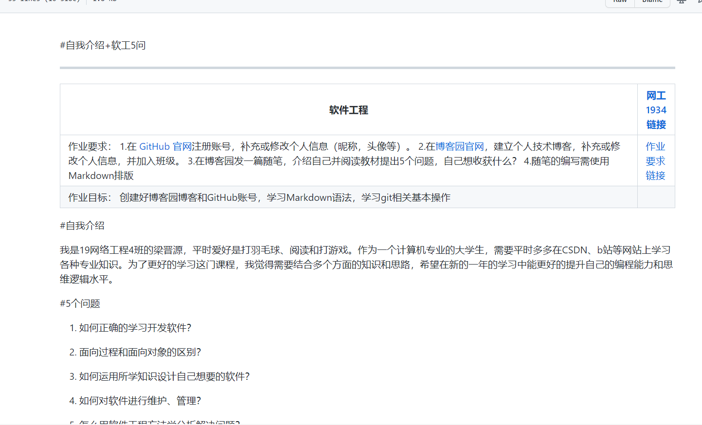 我是19网络工程4班的梁晋源,平时爱好是打羽毛球、阅读和打游戏。作为一个计算机专业的大学生,需要平时多多在CSDN、b站等网站上学习各种专业知识。为了更好的学习这门课程,我觉得需要结合多个方面的知识和思路,希望在新的一年的学习中能更好的提升自己的编程能力和思维逻辑水平。