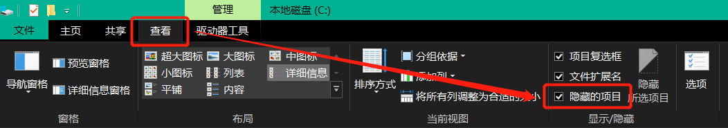 Tips: 默认情况下,Appdata目录是隐藏的,如果需要让其可见,需要在文件资源管理器上方的选项卡”查看“内将“隐藏的项目名”复选框选中: