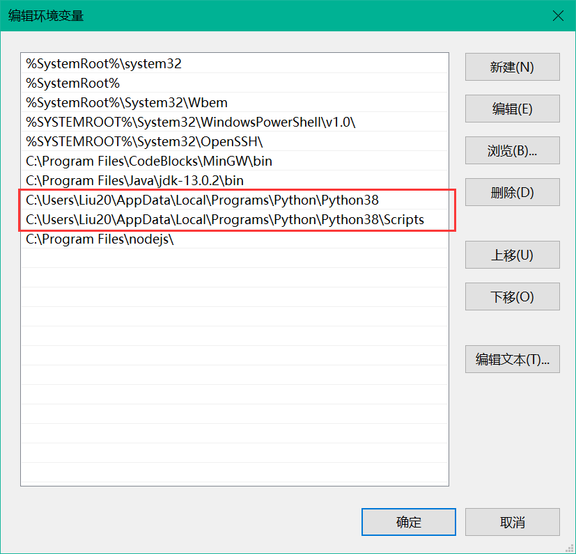 d. 右侧选择“新建”或“浏览”,将刚才安装好的 python38 与其目录下的 Scripts 文件夹两个路径分别添加到其中,如下图红框所示