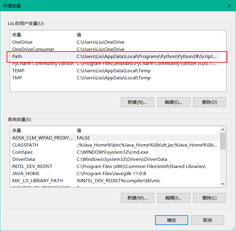 - 首先,按照上述方法打开”环境变量“窗口,在上方的”用户变量“中找到”Path“并双击进入编辑