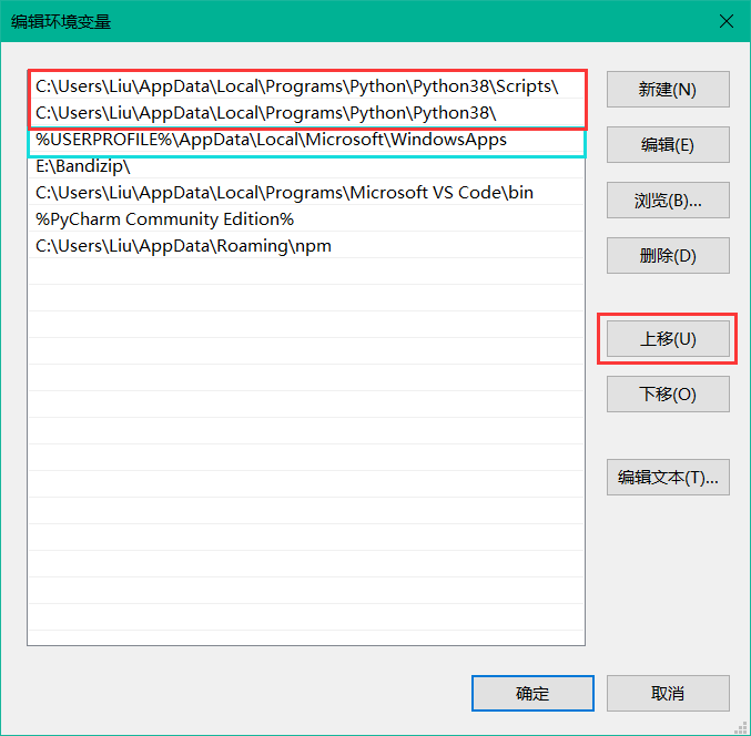 - 右侧选择“新建”,将 Python 的安装目录和 Python 安装目录下的 Script 文件夹两个路径分别添加到其中,并分别选定两个路径,将其上移到路径 %USERPROFILE%\AppData\Local\Microsoft\WindowsApps 的上面,如下所示