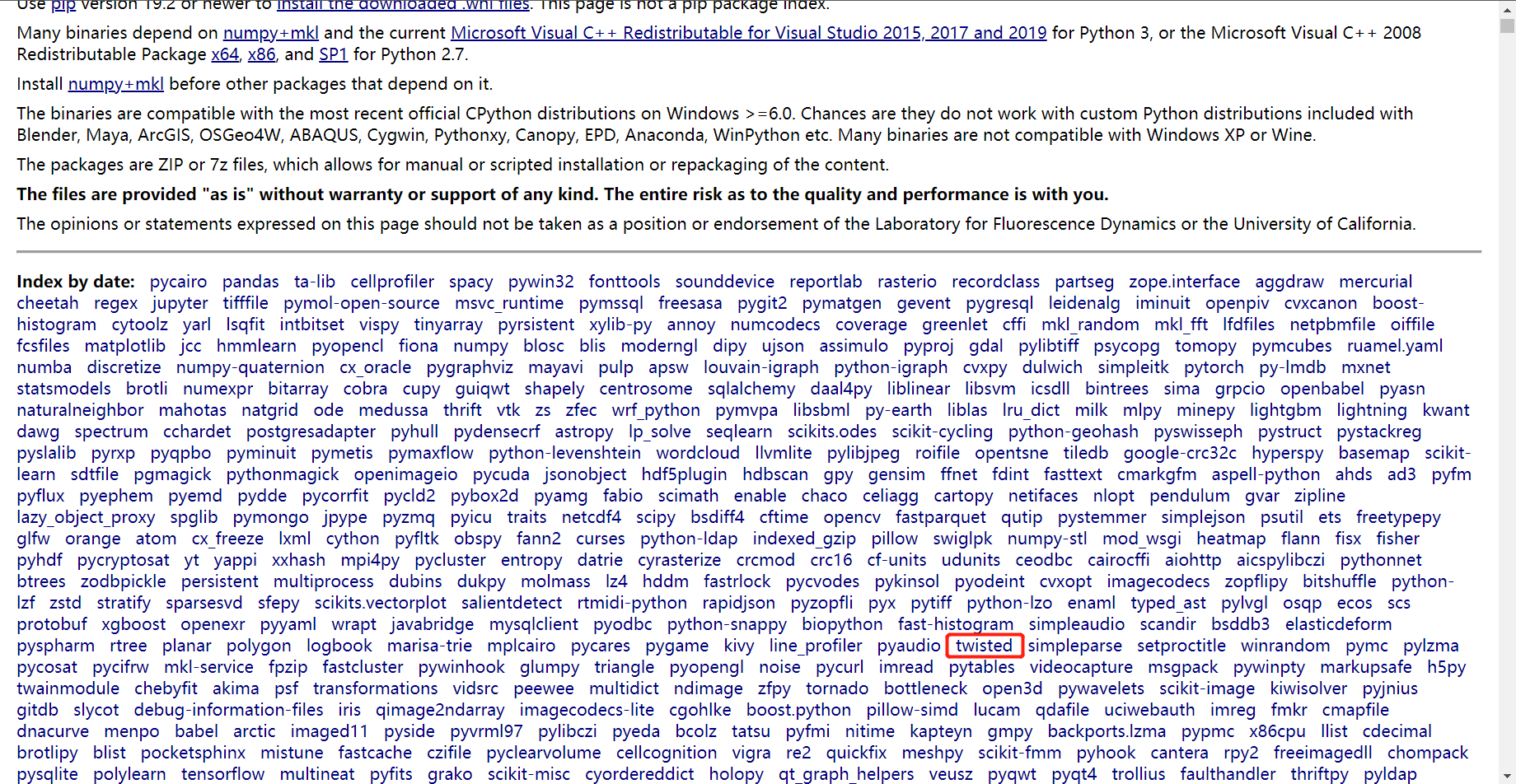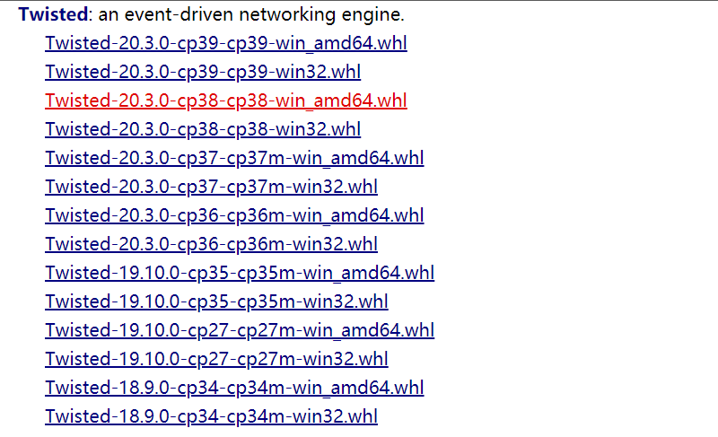 1. 访问 https://www.lfd.uci.edu/~gohlke/pythonlibs/,并在 Index by date 中找到 Twisted 条目