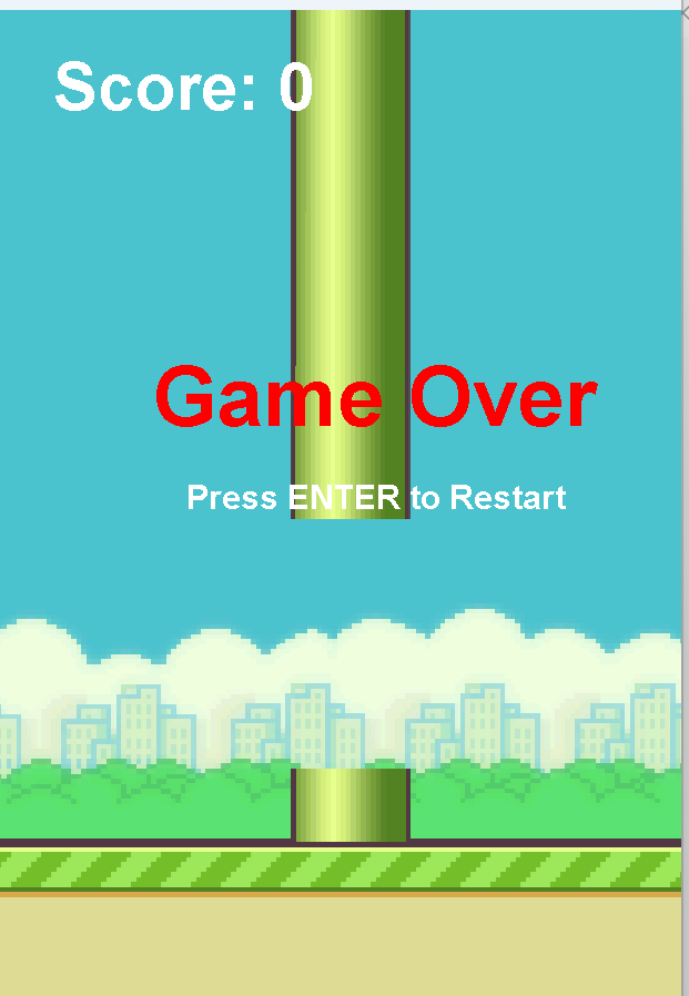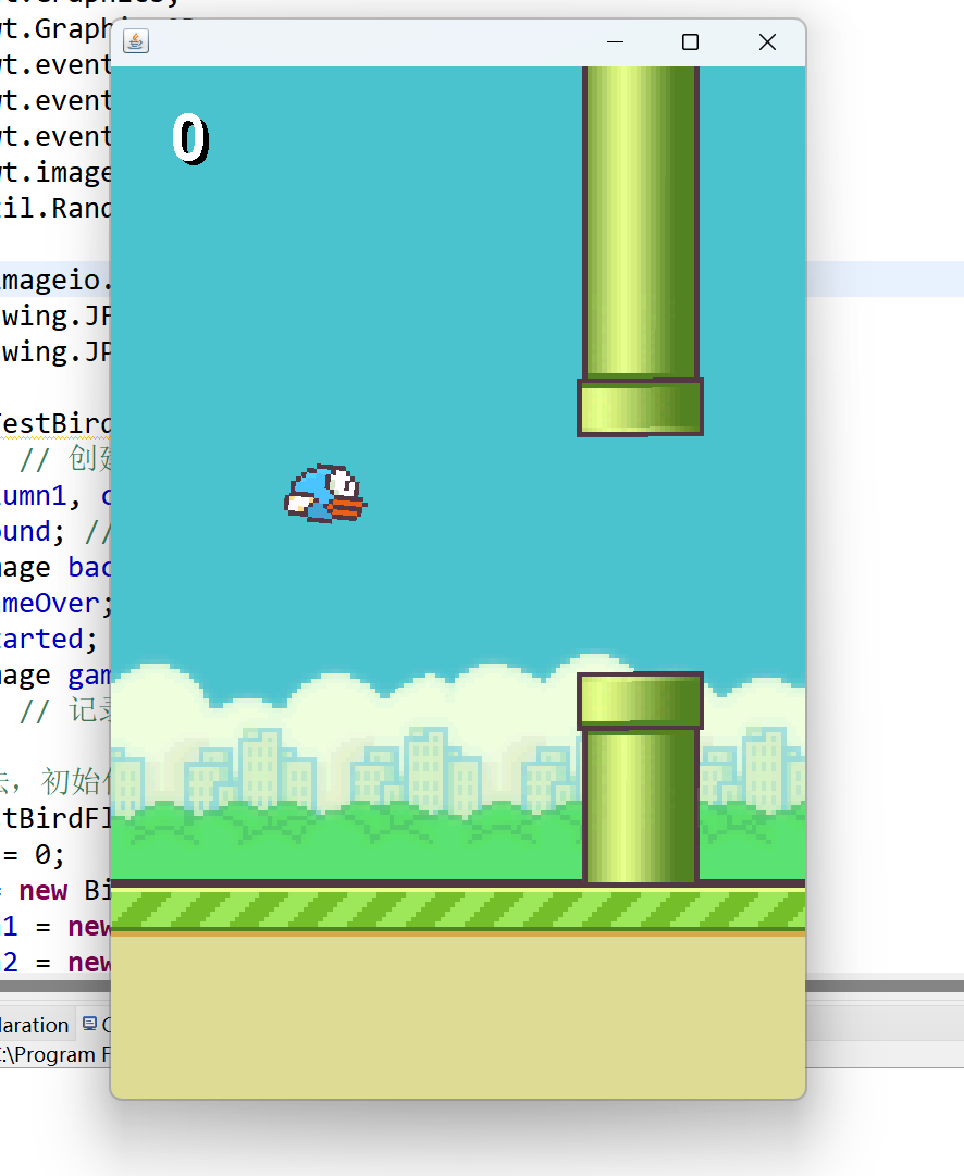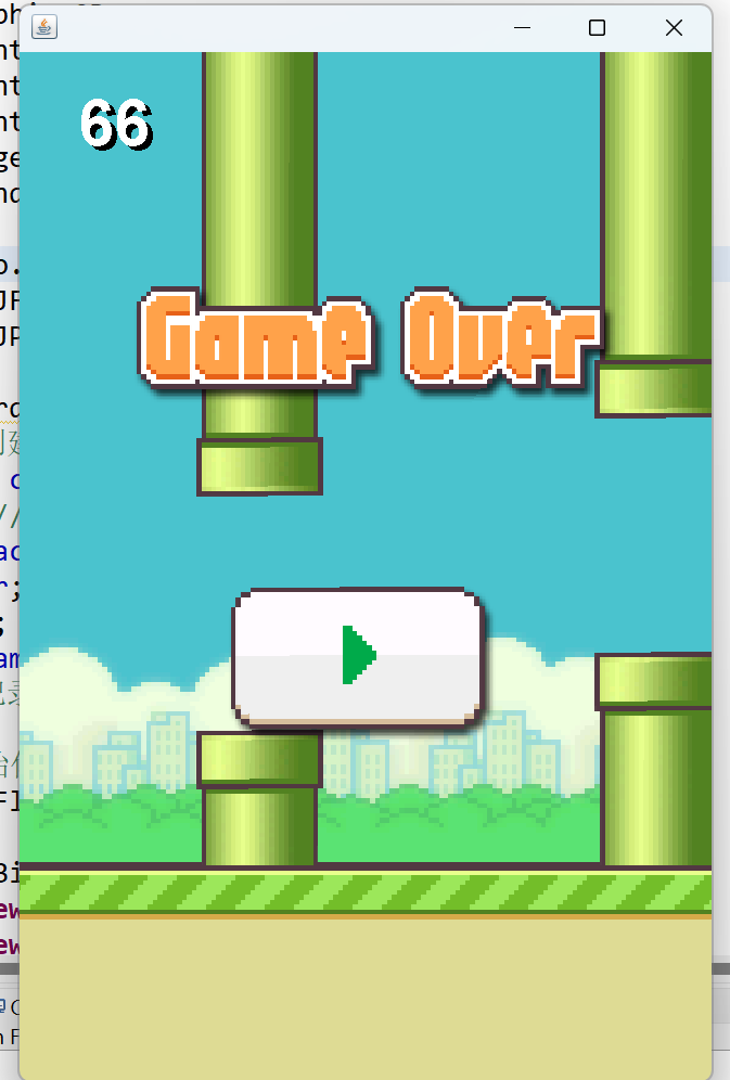 3.原项目存在二个漏洞,在bird触碰外物gg时,无法便捷重新开始游戏,并且背景仍在不断刷新,左上角分数按照原项目加分逻辑会一直+1,无法看到定格的最后玩家取得的分数。