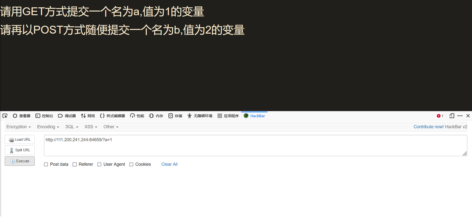 然后我们点击Load URL将链接加载到输入框内,在后面输入/?a=1,然后点击execute(英文意思:处决),发现页面多出来了一行字,要求我们用post方式提交一个变量b