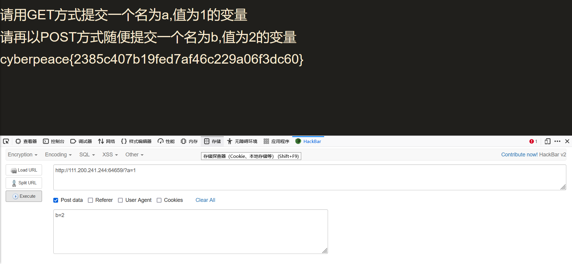我们可以勾选下面Post data,在Post data里面输入一个变量b,并赋值2,再次点击execute提交,就可以获得flag