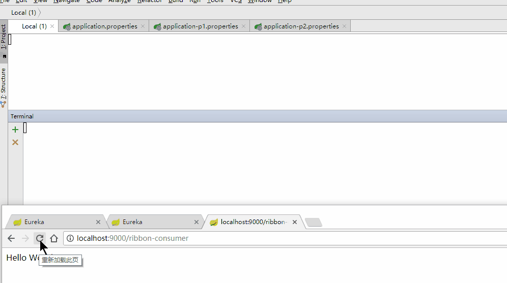 答案是服务消费者可以获取到两个服务提供者提供的服务。虽然两个服务提供者的信息分别被两个服务注册中心所维护,但是由于服务注册中心之间也互相注册为服务,当服务提供者发送请求到一个服务注册中心时,它会将该请求转发给集群中相连的其他注册中心,从而实现注册中心之间的服务同步,通过服务同步,两个服务提供者的服务信息我们就可以通过任意一台注册中心来获取到。OK,下面我们来通过一个简单的案例来验证一下我们上面的理论: