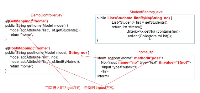用户在JSP页面点击、输入信息,传入servlet里,servlet get方法得到处理,然后使用model的处理方法,得到需要返回的数据,再通过servlet传入到jsp