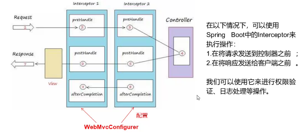 //在处理方法之前执行,一般用来做准备工作,比如日志、权限检查,false即被拦截,true继续,不会继续调用其他两个方法,此时我们需要通过 response 来产生响应