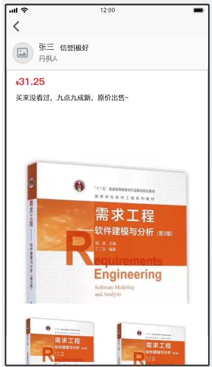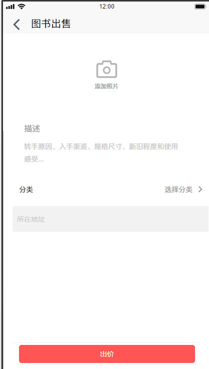 比如进入出售里的图书出售大类后,用户只需要提供所要出售二手商品的照片以及对于商品的描述还有商品所属更细致分类即可在我们的小程序中上架。