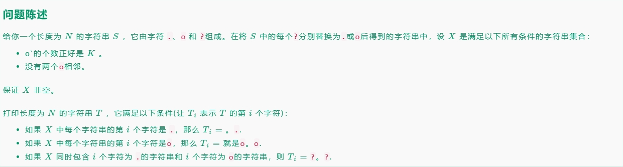 对于所有的"\(o\)",其两边一定是".",把这个先填上,然后对于每段连续的"\(?\)",此时两段一定是".",若区间长度为奇数,填法就固定了(如\(.o.o.o.\));若为偶数则有两种填法(\(.o.o..\)或\(..o.o.\))。统计出最多能有多少\(o\),记为 \(cnt\),若 \(cnt=k\),则奇数区间确定,偶数区间不确定;若 \(cnt>k\),则都不能确定;不存在 \(cnt<k\)的情况。