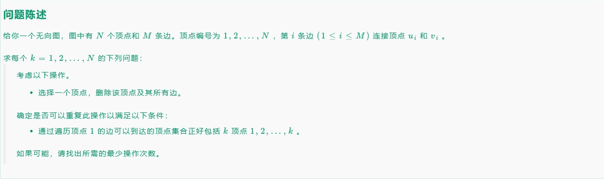 用并查集维护当前的连通分量,对于\(k\),大于\(k\)的点需要删除,为防止重复用\(set\)储存;小于等于\(k\)的点需要保留,但是最后需要判断\([1,k]\)是否只有一个连通分量