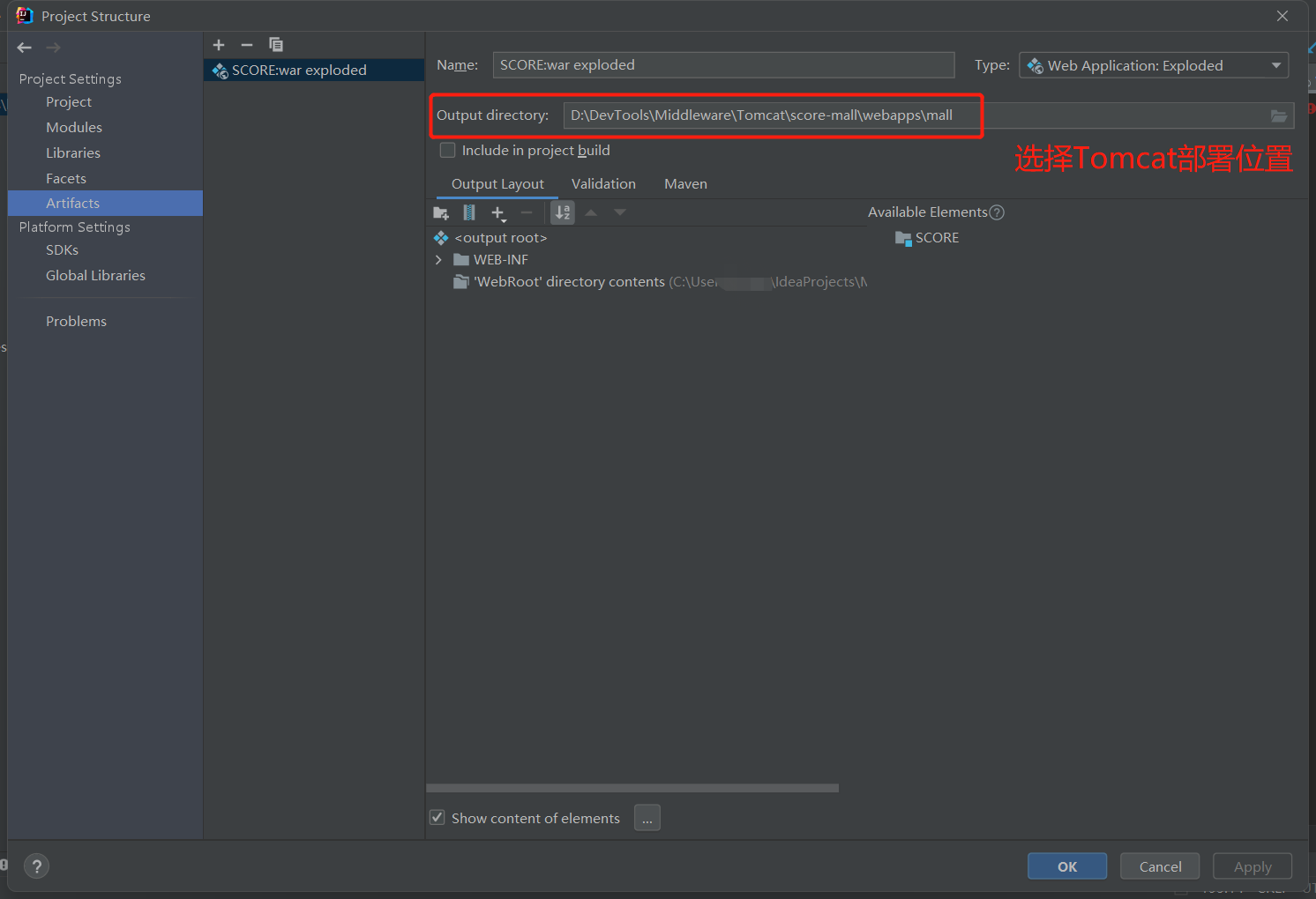 由于是开发环境,类型选择Exploded,方便查看代码是否生效。Output Directory选择Tomcat部署路径。