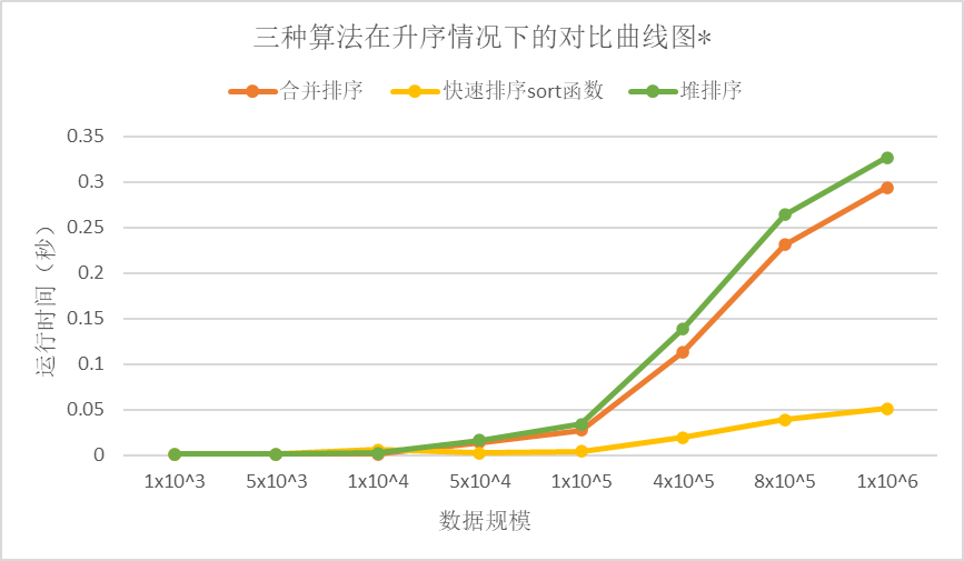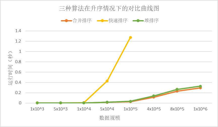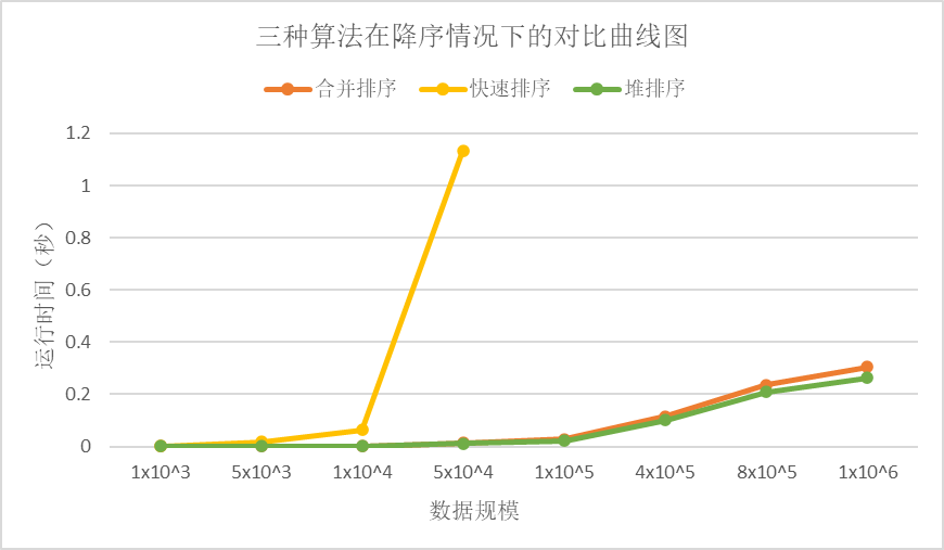 从降序情况下的对比曲线图中我们可以看出,堆排序是最快的,其次是合并排序,最后是快速排序。快速排序因为递归调用次数太多导致内存溢出,无法正常进行排序。