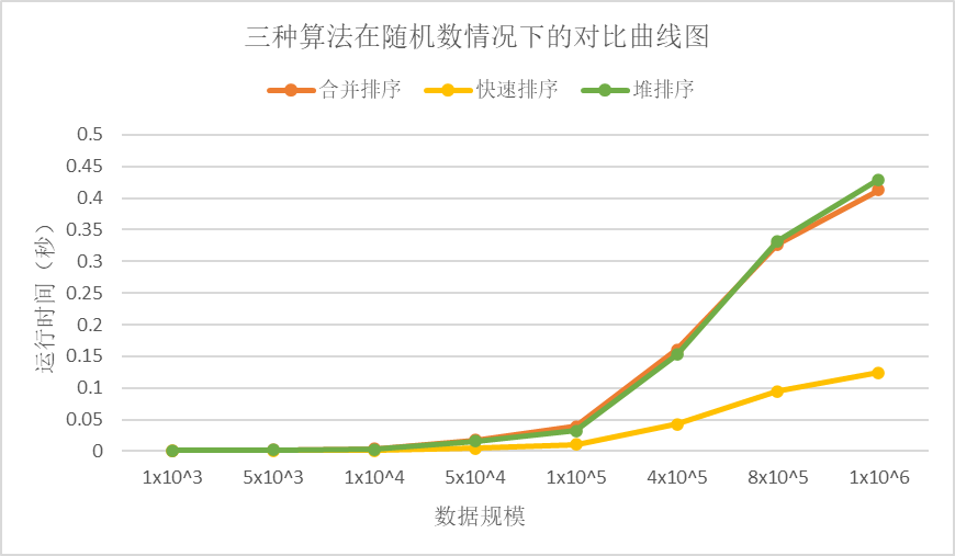 由上统计图和表中我们可以看出,在随机数的情况下,无论是哪个数据规模下快速排序是最快的,合并排序和堆排序所用时间相近,在数据规模较小的情况下,堆排序的时间稍快,在数据规模较大的情况下,合并排序快。