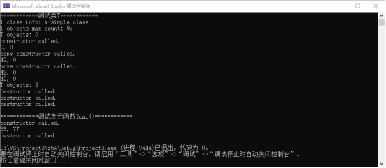 1 // 一个简单的类T:定义、使用 2 #include <iostream> 3 #include <string> 4 using namespace std; 5 // 类T的声明 6 class T { 7 public: 8 T(int x = 0, int y = 0); // 带有默认形值的构造函数 9 T(const T &t); // 复制构造函数 10 T(T &&t); // 移动构造函数 11 ~T(); // 析构函数 12 void set_m1(int x); // 设置T类对象的数据成员m1 13 int get_m1() const; // 获取T类对象的数据成员m1 14 int get_m2() const; // 获取T类对象的数据成员m2 15 void display() const; // 显示T类对象的信息 16 friend void func(); // 声明func()为T类友元函数 17 private: 18 int m1, m2; 19 public: 20 static void disply_count(); // 类方法,显示当前T类对象数目 21 public: 22 static const string doc; // 类属性,用于描述T类 23 static const int max_count; // 类属性,用于描述T类对象的上限 24 private: 25 static int count; // 类属性,用于描述当前T类对象数目 26 }; 27 // 类的static数据成员:类外初始化 28 const string T::doc{"a simple class"}; 29 const int T::max_count = 99; 30 int T::count = 0; 31 // 类T的实现 32 T::T(int x, int y): m1{x}, m2{y} { 33 ++count; 34 cout << "constructor called.\n"; 35 } 36 T::T(const T &t): m1{t.m1}, m2{t.m2} { 37 ++count; 38 cout << "copy constructor called.\n"; 39 } 40 T::T(T &&t): m1{t.m1}, m2{t.m2} { 41 ++count; 42 cout << "move constructor called.\n"; 43 } 44 T::~T() { 45 --count; 46 cout << "destructor called.\n"; 47 } 48 void T::set_m1(int x) { 49 m1 = x; 50 } 51 int T::get_m1() const { 52 return m1; 53 } 54 int T::get_m2() const { 55 return m2; 56 } 57 void T::display() const { 58 cout << m1 << ", " << m2 << endl; 59 } 60 // 类方法 61 void T::disply_count() { 62 cout << "T objects: " << count << endl; 63 } 64 // 友元函数func():实现 65 void func() { 66 T t1; 67 t1.set_m1(55); 68 t1.m2 = 77; // 虽然m2是私有成员,依然可以直接访问 69 t1.display(); 70 } 71 // 测试 72 void test() { 73 cout << "T class info: " << T::doc << endl; 74 cout << "T objects max_count: " << T::max_count << endl; 75 T::disply_count(); 76 T t1; 77 t1.display(); 78 t1.set_m1(42); 79 T t2{t1}; 80 t2.display(); 81 T t3{std::move(t1)}; 82 t3.display(); 83 t1.display(); 84 T::disply_count(); 85 } 86 // 主函数 87 int main() { 88 cout << "============测试类T============" << endl; 89 test(); 90 cout << endl; 91 cout << "============测试友元函数func()============" << endl; 92 func(); 93 }