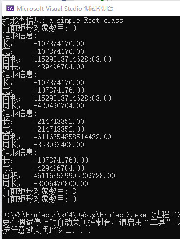 1 #include <iostream> 2 #include <string> 3 #include <iomanip> 4 using namespace std; 5 // 矩形类Rect的定义 6 // 待补足 7 class Rect { 8 public: 9 Rect(float l= 2.0, float w = 1.0); 10 Rect(const Rect& r); 11 ~Rect(); 12 13 float len() const; 14 float wide() const; 15 float area() const; 16 float circumference() const; 17 void resize(int t); 18 void resize(int lt, int wt); 19 20 21 private: 22 float length, width; 23 public: 24 static int size_info(){ 25 return size; 26 }; 27 public: 28 static const string doc; 29 private: 30 static int size; 31 32 }; 33 34 const string Rect::doc{ "a simple Rect class" }; 35 int Rect::size; 36 37 Rect::Rect(float l, float w) { 38 ++size; 39 } 40 41 42 Rect::Rect(const Rect& r) { 43 ++size; 44 } 45 46 Rect::~Rect() { 47 --size; 48 } 49 50 float Rect::len() const { 51 return length; 52 } 53 54 float Rect::wide() const { 55 return width; 56 } 57 58 float Rect::area() const { 59 float area; 60 return area = length * width; 61 } 62 63 float Rect::circumference() const { 64 float circumference; 65 return circumference = 2 * (length + width); 66 } 67 68 void Rect::resize(int t) { 69 length *= t; 70 width *= t; 71 } 72 73 void Rect::resize(int lt,int wt) { 74 length *= lt; 75 width *= wt; 76 } 77 78 79 // 普通函数:输出矩形信息 80 void output(const Rect& r) { 81 cout << "矩形信息: " << endl; 82 cout << fixed << setprecision(2); // 控制输出格式:以浮点数形式输出,小数部分保留两位 83 // 补足代码:分行输出矩形长、宽、面积、周长 84 cout << "长: " << r.len() << endl; 85 cout << "宽: " << r.wide() << endl; 86 cout << "面积: " << r.area() << endl; 87 cout << "周长: " << r.circumference() << endl; 88 } 89 // 测试代码 90 void test() { 91 cout << "矩形类信息: " << Rect::doc << endl; 92 cout << "当前矩形对象数目: " << Rect::size_info() << endl; 93 Rect r1; 94 output(r1); 95 Rect r2(4, 3); 96 output(r2); 97 Rect r3(r2); 98 r3.resize(2); 99 output(r3); 100 r3.resize(5, 2); 101 output(r3); 102 cout << "当前矩形对象数目: " << Rect::size_info() << endl; 103 } 104 // 主函数 105 int main() { 106 test(); 107 cout << "当前矩形对象数目: " << Rect::size_info() << endl; 108 }