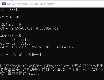1 #include <iostream> 2 #include <complex> 3 // 测试标准库提供的复数类模板complex 4 void test_std_complex() { 5 using namespace std; 6 complex<double> c1{3, 4}, c2{4.5}; 7 const complex<double> c3{c2}; 8 cout << "c1 = " << c1 << endl; 9 cout << "c2 = " << c2 << endl; 10 cout << "c3 = " << c3 << endl; 11 cout << "c3.real = " << c3.real() << ", " << "c3.imag = " << c3.imag() 12 << endl; 13 cout << "c1 + c2 = " << c1 + c2 << endl; 14 cout << "c1 - c2 = " << c1 - c2 << endl; 15 cout << "abs(c1) = " << abs(c1) << endl; // abs()是标准库数学函数,对复数取模 16 cout << boolalpha; // 设置bool型值以true/false方式输出 17 cout << "c1 == c2: " << (c1 == c2) << endl; 18 cout << "c3 == c2: " << (c3 == c2) << endl; 19 complex<double> c4 = 2; 20 cout << "c4 = " << c4 << endl; 21 c4 += c1; 22 cout << "c4 = " << c4 << endl; 23 } 24 int main() { 25 test_std_complex(); 26 }
