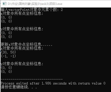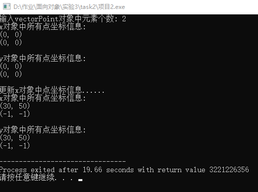 1 #include "vectorPoint.hpp" 2 #include <iostream> 3 4 void output(const vectorPoint &v) { 5 for(auto i = 0; i < v.get_size(); ++i) 6 v.at(i).show(); 7 } 8 9 void test() { 10 using namespace std; 11 12 int n; 13 cout << "输入vectorPoint对象中元素个数: "; 14 cin >> n; 15 16 vectorPoint x(n); 17 cout << "x对象中所有点坐标信息: " << endl; 18 output(x); 19 20 vectorPoint y(x); 21 cout << "\ny对象中所有点坐标信息: " << endl; 22 output(y); 23 24 cout << "\n更新x对象中点坐标信息......" << endl; 25 x.at(0).move(30, 50); 26 x.at(1).move(-1, -1); 27 28 cout << "x对象中所有点坐标信息: " << endl; 29 output(x); 30 31 cout << "\ny对象中所有点坐标信息: " << endl; 32 output(y); 33 } 34 35 int main() { 36 test(); 37 }
