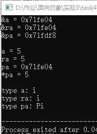 1 #include <iostream> 2 #include <typeinfo> 3 using namespace std; 4 int main() { 5 int a; 6 int &ra = a; 7 ra = 4; 8 int *pa = &a; 9 *pa = 5; 10 // 以十六进制形式输出普通变量a, 引用变量ra,指针变量pa的地址 11 cout << "&a = " << hex << &a << endl; 12 cout << "&ra = " << hex << &ra << endl; 13 cout << "&pa = " << hex << &pa << "\n\n"; 14 // 输出普通变量a, 引用变量ra,指针变量pa的值 15 cout << "a = " << a << endl; 16 cout << "ra = " << a << endl; 17 cout << "pa = " << hex << pa << endl; 18 // 输出指针变量pa指向的变量的值 19 cout << "*pa = " << *pa << "\n\n"; 20 // 输出普通变量a,引用变量ra, 指针变量pa的类型信息 21 cout << "type a: " << typeid(a).name() << endl; 22 cout << "type ra: " << typeid(ra).name() << endl; 23 cout << "type pa: " << typeid(pa).name() << endl; 24 }
