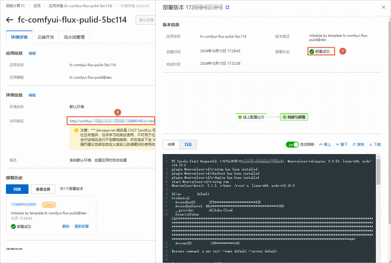 8.等待约1分钟,部署状态变为部署成功,表示应用部署成功,并生成访问域名,单击访问域名后的链接,开始体验Flux大模型生图。
