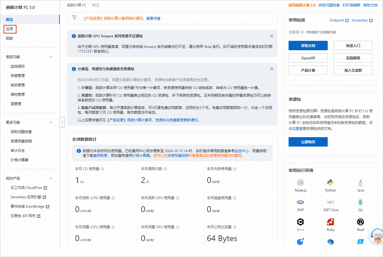 领取函数计算FC免费额度:https://common-buy.aliyun.com/package?planCode=package_fcfreecu_cn