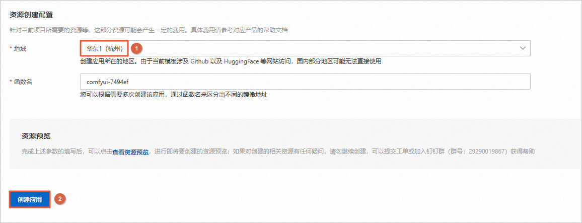 由于当前模板涉及Github以及HuggingFace等网站访问,国内部分地区可能无法直接使用。其他配置保持默认即可,然后单击创建应用.