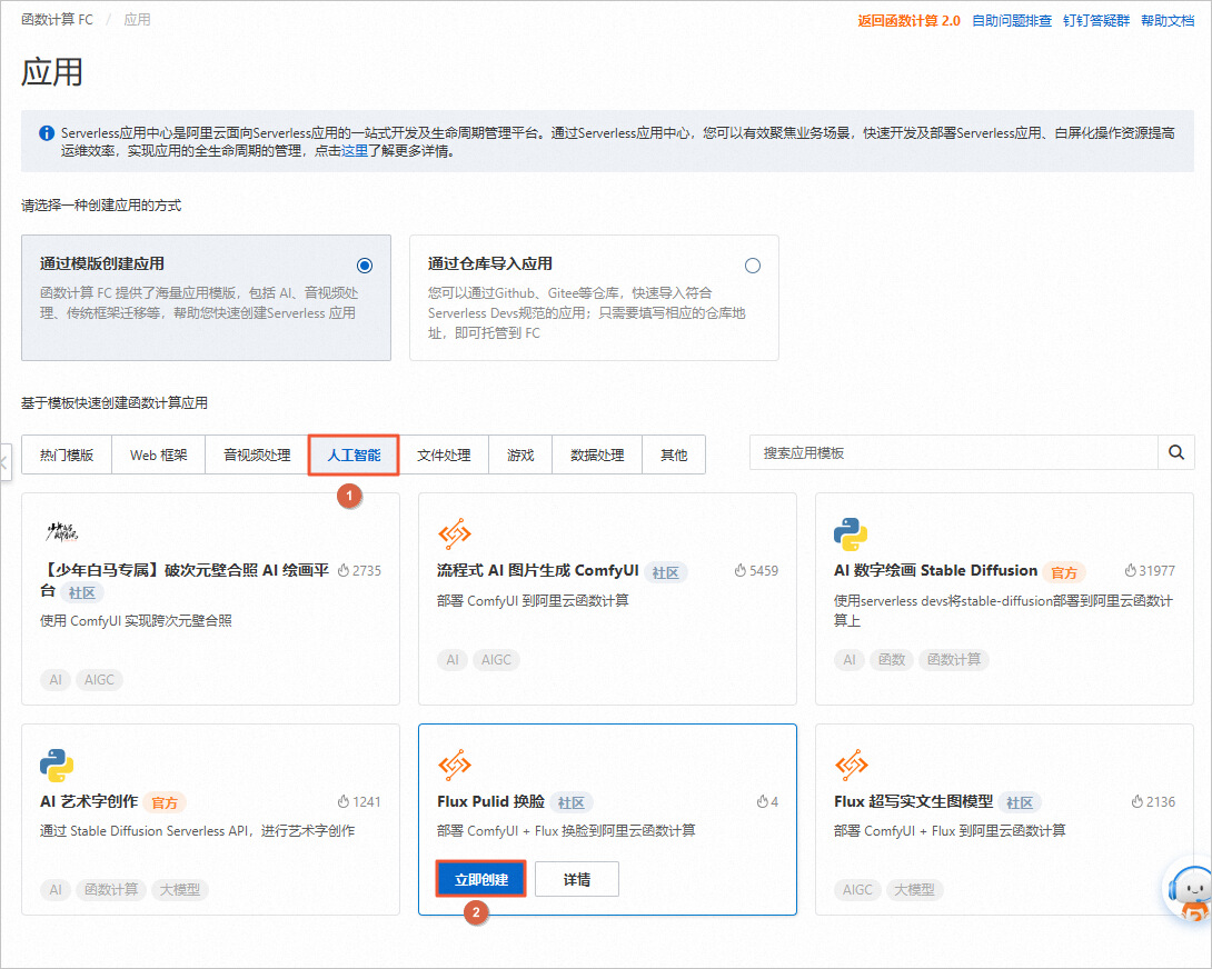 5.在应用页面,选择人工智能>Flux Pulid 换脸,单击立即创建。