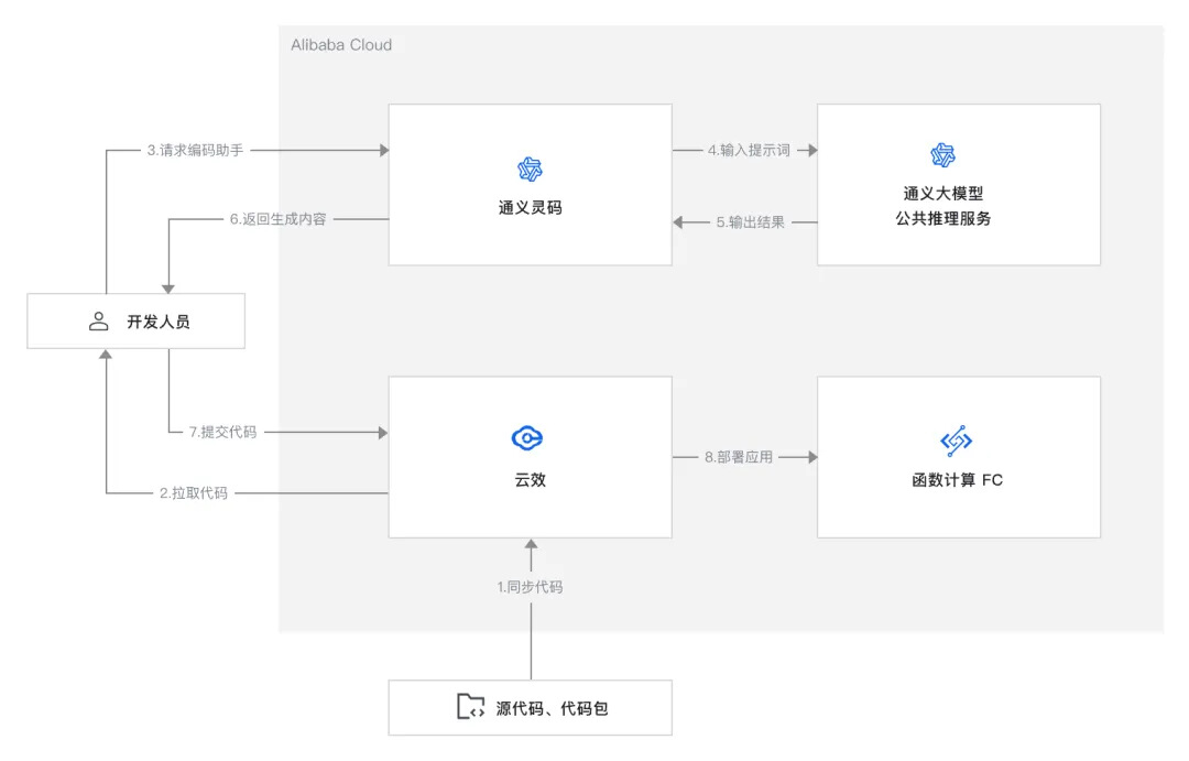 通过云效进行代码托管和持续集成,开发人员从云效拉取代码到本地环境后,利用通义灵码进行代码生成和优化,包括修复缺陷、补充代码注释和单元测试。优化后的代码提交云效,会触发自动化流水线,自动执行代码检测和单元测试,最终,经过验证的代码被部署到函数计算 FC。