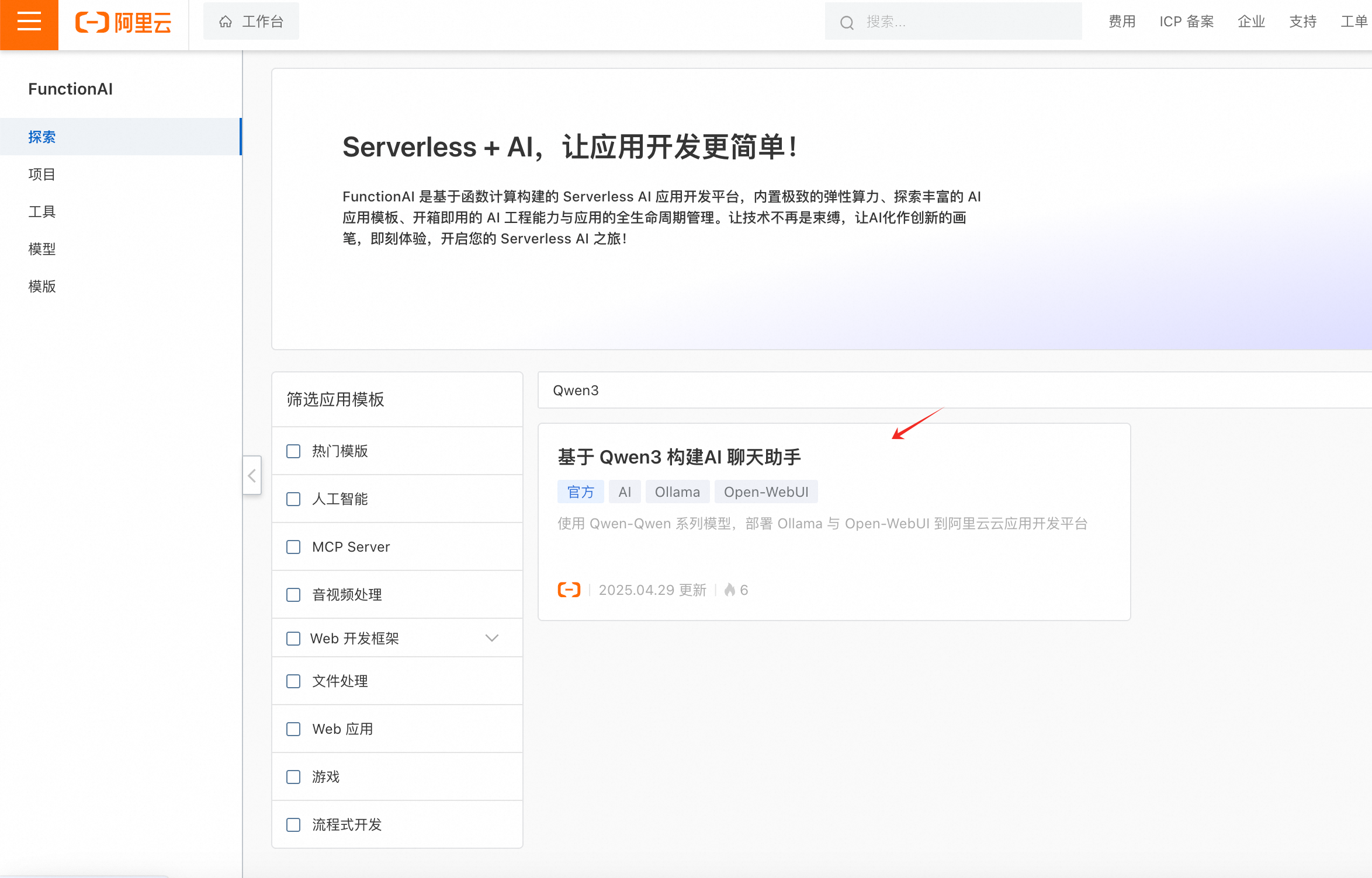 依托于阿里云 函数计算 FC 算力,Serverless+ AI 开发平台 FunctionAI 现已提供模型服务、应用模版两种部署方式辅助您部署 Qwen3 系列模型。 完成模型部署后,您即可与模型进行对话体验;或以 API 形式进行调用,接入 AI 应用中,欢迎您立即体验。