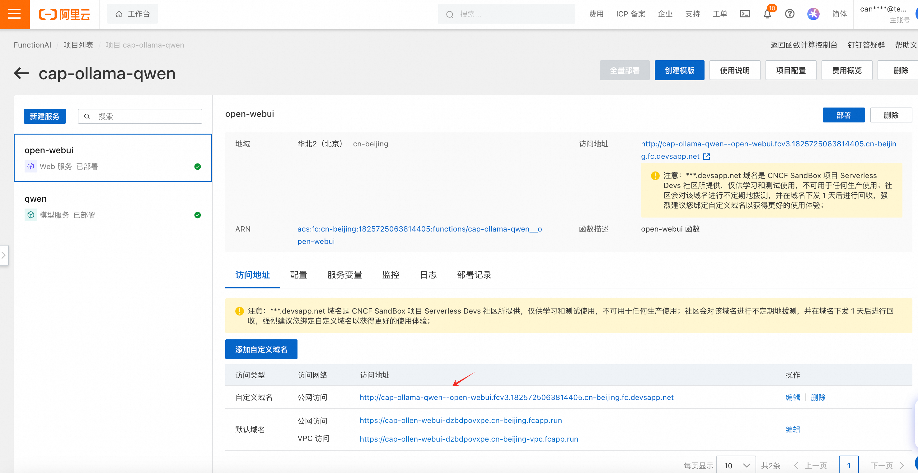 部署完毕后,点击 OpenWebUI 服务,在访问地址内找到“公网访问”