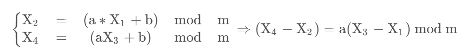 首先要恢复模数m,依然可以构造消去增量b构造等比数列,所以我们依然可以用之前的方法求m