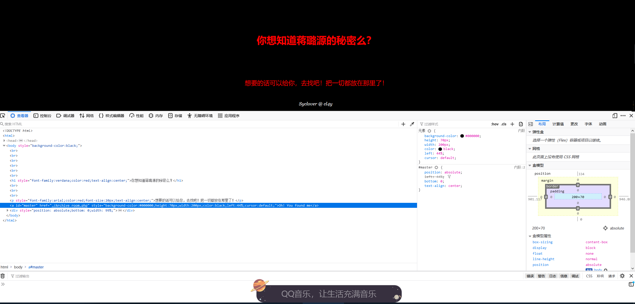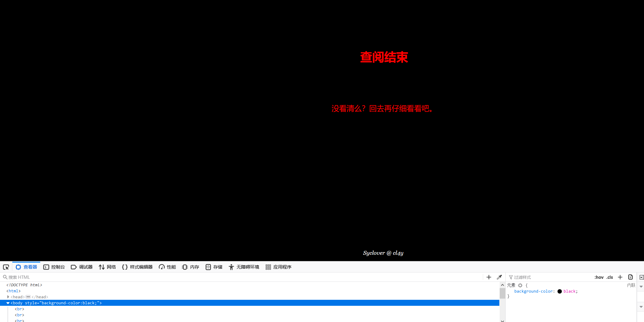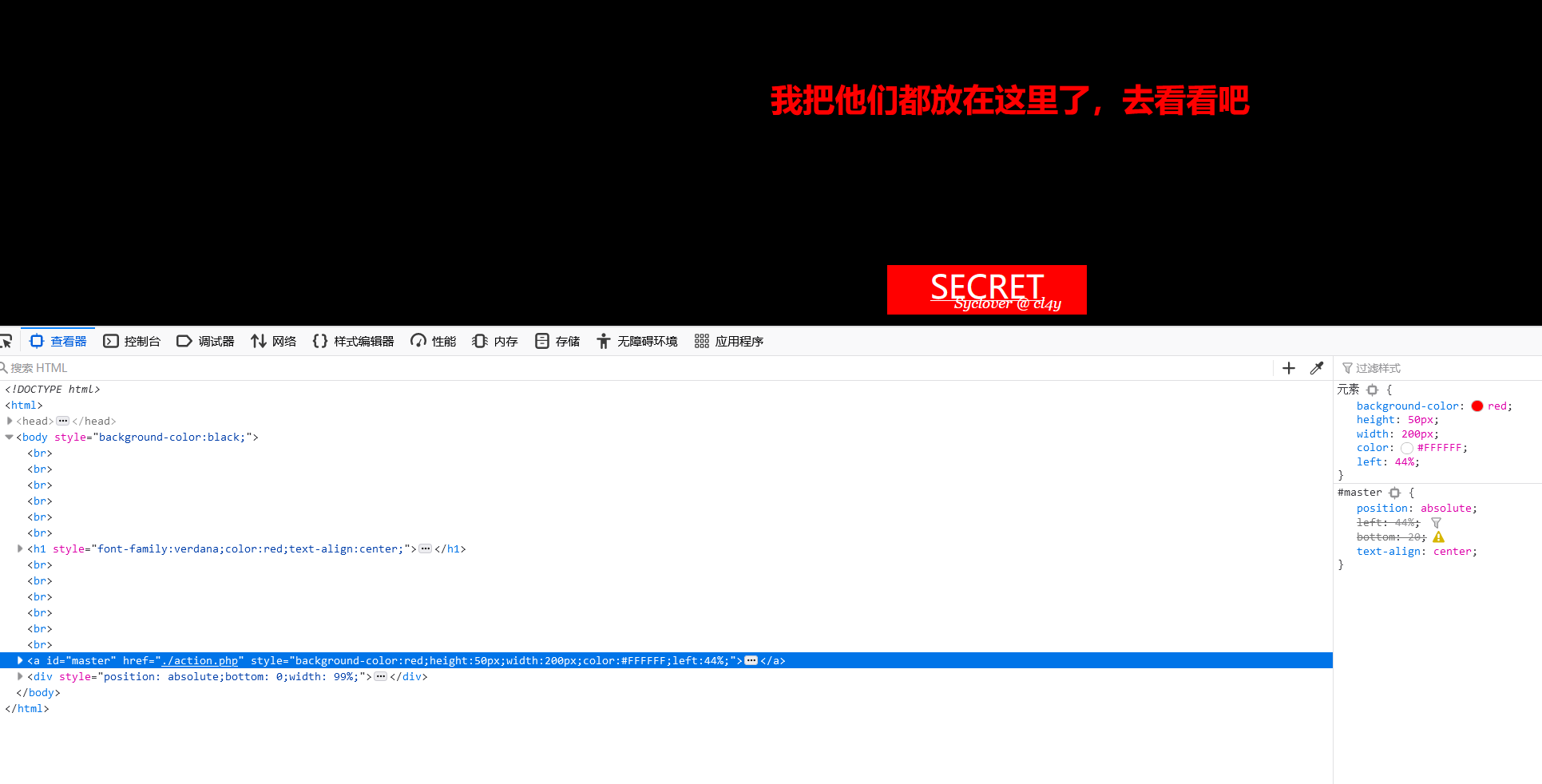 1 <!DOCTYPE html> 2 3 <html> 4 5 <head> 6 <meta charset="utf-8"> 7 <title>FLAG</title> 8 </head> 9 10 <body style="background-color:black;"><br><br><br><br><br><br> 11 12 <h1 style="font-family:verdana;color:red;text-align:center;">啊哈!你找到我了!可是你看不到我QAQ~~~</h1><br><br><br> 13 14 <p style="font-family:arial;color:red;font-size:20px;text-align:center;"> 15 <?php 16 echo "我就在这里"; 17 $flag = 'flag{4aa73f9a-0b37-44be-99ef-6cea8cd5cfe1}'; 18 $secret = 'jiAng_Luyuan_w4nts_a_g1rIfri3nd' 19 ?> 20 </p> 21 </body> 22 23 </html>