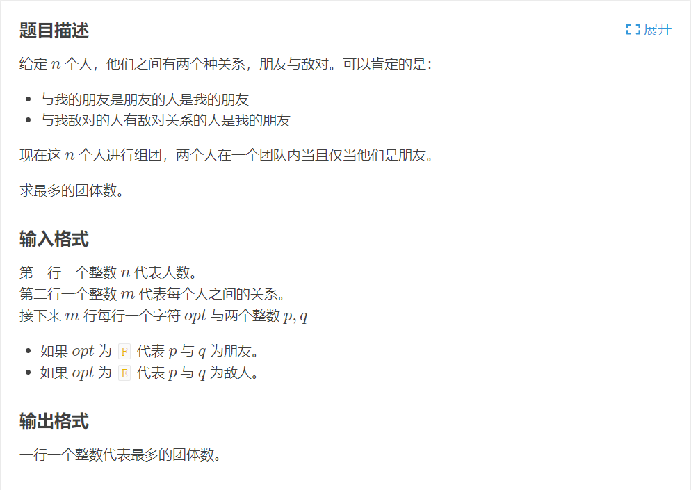 这道题其实操作就是普通并查集的基础合并和查询操作,只是要稍稍思考一下对于 “ 我朋友的朋友是我的朋友,我敌人的敌人也是我的朋友 ” 这两句话的处理方法。
