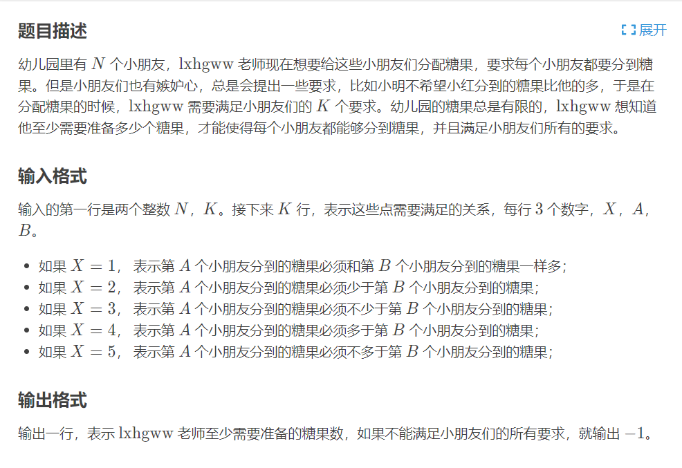 然后再就是套个差分约束板子就行,注意有负环时无解,而且每个点至少有一个糖果。