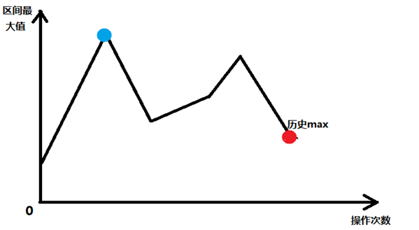 对于这样的一个操作序列,如果我们仅仅是把历史最大值和当前最大值一起做更新(即只考虑把tag全部放下之后的情况)就会导致上面这种情况。很明显,这张图的历史最大值是在蓝色点所在处。