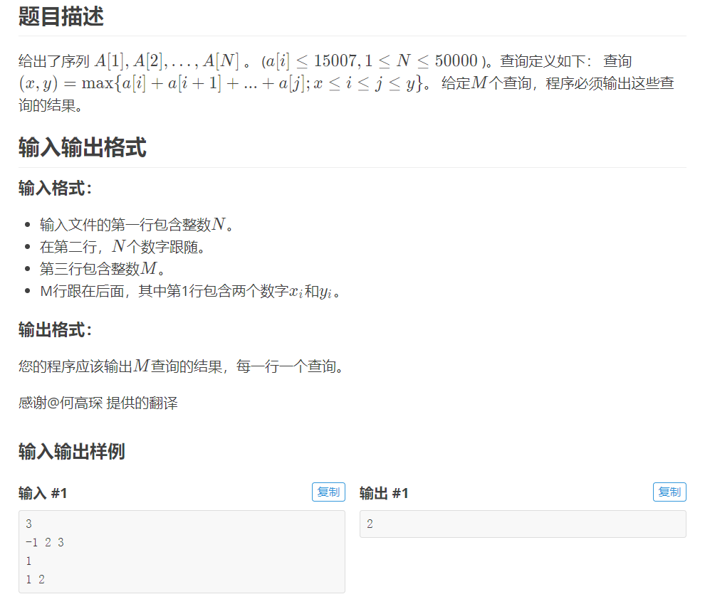 首先说明一下这道题的重难点。这道题由于没有更新操作,所以我们就省去了update和维护lazytag的麻烦,但是不要高兴的太早。这道题要求我们求区间最大子段和,这个东西显然很不好维护。