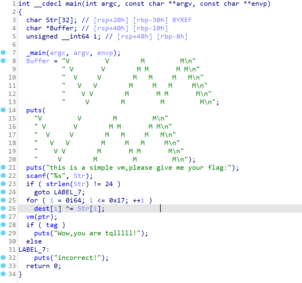 无壳,IDA 打开发现输入一个长为 24 的字符串,将一个全局数组 dest 与其按位异或,然后将一个全局数组 ptr 传入 vm,作为执行的操作序列: