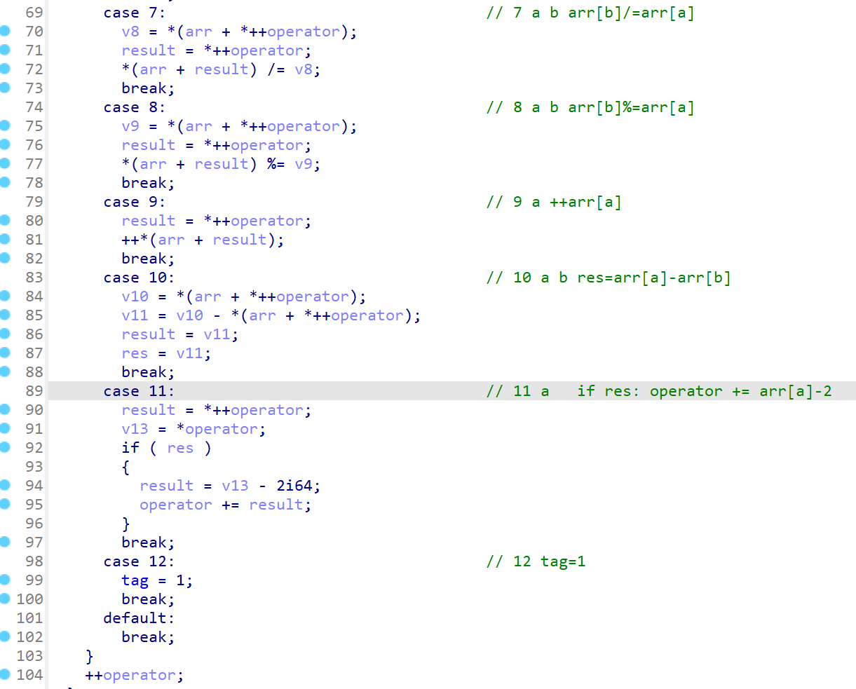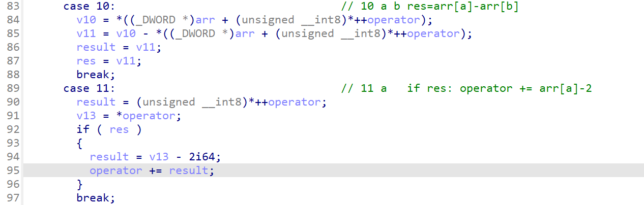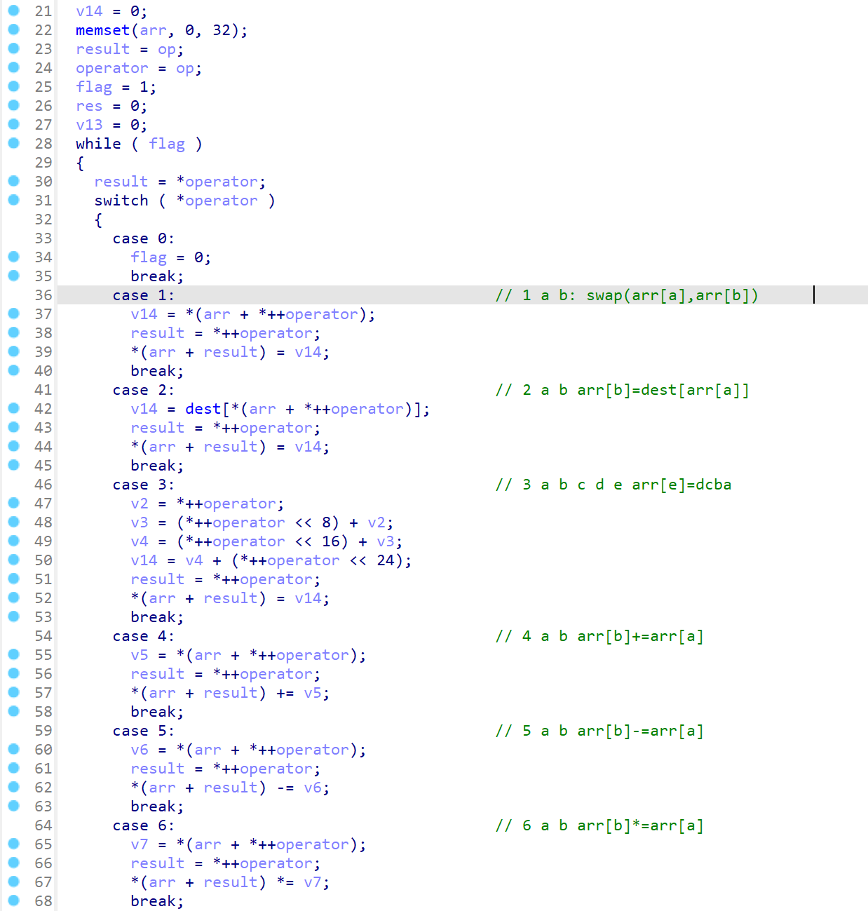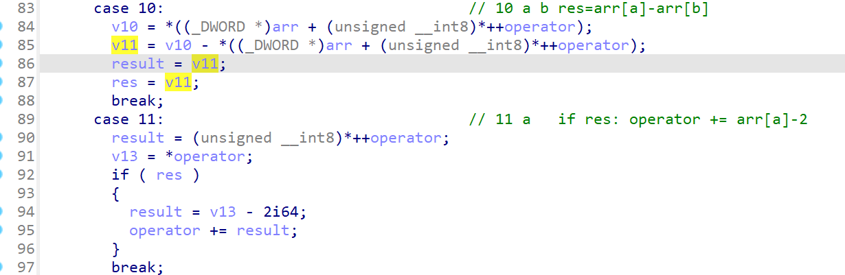 写出 vm 各个操作对应的各个操作,需要注意的是 case 10 中赋值给 result 的 v11 是 unsigned int 的类型,而在其他所有 case 中赋值给 result 的都是 unsigned char 的类型: