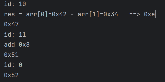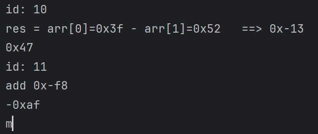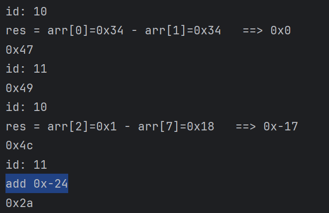 在 python 脚本中,将 dest[0] 与 v 的 ASCLL 异或,再次执行操作序列发现,程序继续在判断 res=0 后的下一个 case 10;case 11 中,将 operator 减少了 0x24,使得程序循环了: