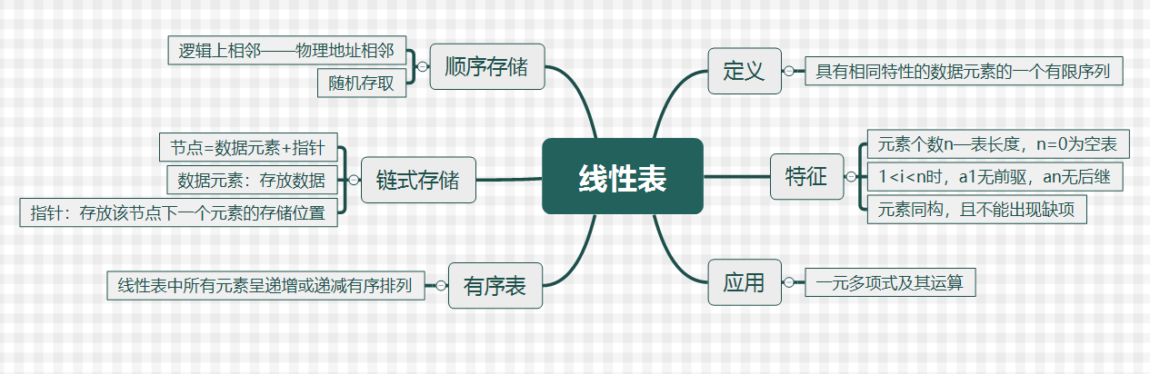 这一章主要是介绍线性表的两种的存储结构:顺序存储结构(顺序表)和链式存储结构(链表),前者可通过数组来实现,看着亲切,学起来也容易些;后者与指针相关,但比较不容易理解。下图为思维导图:
