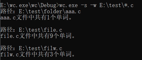 程序实现了-c,-w,-l,-s,-a功能,同时-s输入支持通配符。