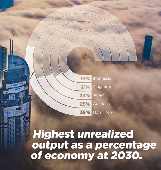 此外,亚太地区的几个主要金融中心也呈现人才短缺的趋势。到2030年,香港、新加坡呈现出了80%和61%的人才短缺;因此而未实现的年产值相当于整个经济基数的39%和21%。而澳大利亚、日本则未实现的年产值分别为25%和24%;印度尼西亚则是19%。