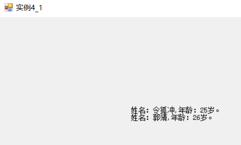 using System; using System.Collections.Generic; using System.ComponentModel; using System.Data; using System.Drawing; using System.Linq; using System.Text; using System.Threading.Tasks; using System.Windows.Forms; namespace 第4章 { public partial class 实例4_1 : Form { public 实例4_1() { InitializeComponent(); } class Student { //定义类的数据成员 public string name; public int age; //定义类的方法成员 public string GetMessage() { return string.Format("姓名:{0},年龄:{1}岁。", this.name, this.age); } } private void 实例4_1_Load(object sender, EventArgs e) { Student a; //声明一个Student对象a a = new Student(); //为a分配内存空间 Student b = new Student(); //申明同时创建对象b a.name = "令狐冲"; //修改对象a的数据成员的值 a.age = 25; string strMsg = a.GetMessage(); //调用对象a的方法成员 lblShow.Text = strMsg; b.name = "郭靖"; //修改对象b的数据成员的值 b.age = 26; lblShow.Text += "\n" + b.GetMessage(); //调用对象b的方法成员 } } }